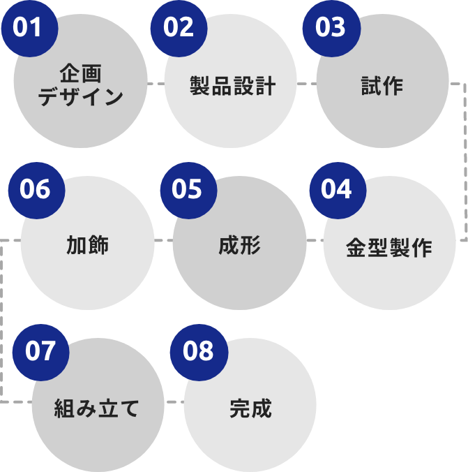 企画開発段階のご提案から、試作品の製作、金型設計製造、量産品の成形、加飾、アセンブリまで一貫したご対応が可能です。
